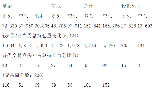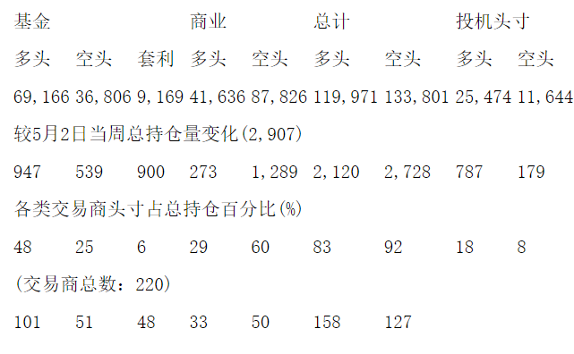 美国商品期货交易委员会(CFTC)最新公布截止5月9日当周COX白银期货和期权分类持仓报告: 合约单位:5000金衡盎司总持仓量:179369