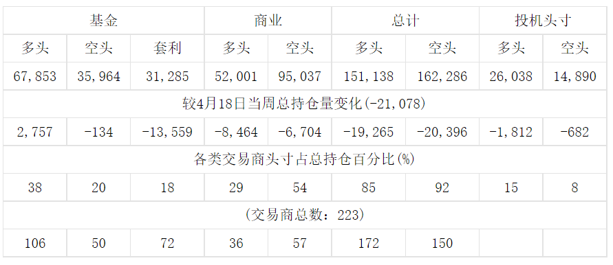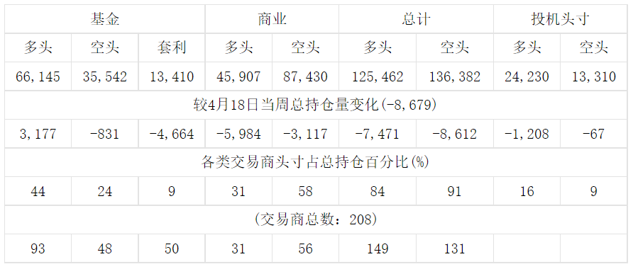 美国商品期货交易委员会(CFTC)最新公布截止4月25日当周COX白银期货和期权分类持仓报告: 合约单位:5000金衡盎司总持仓量:177176