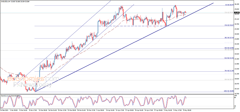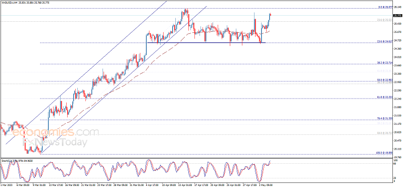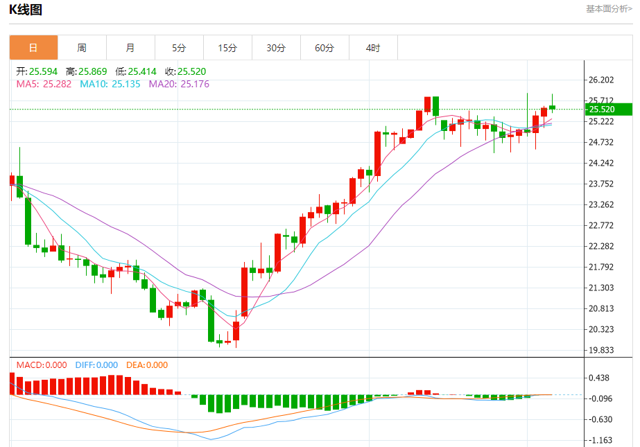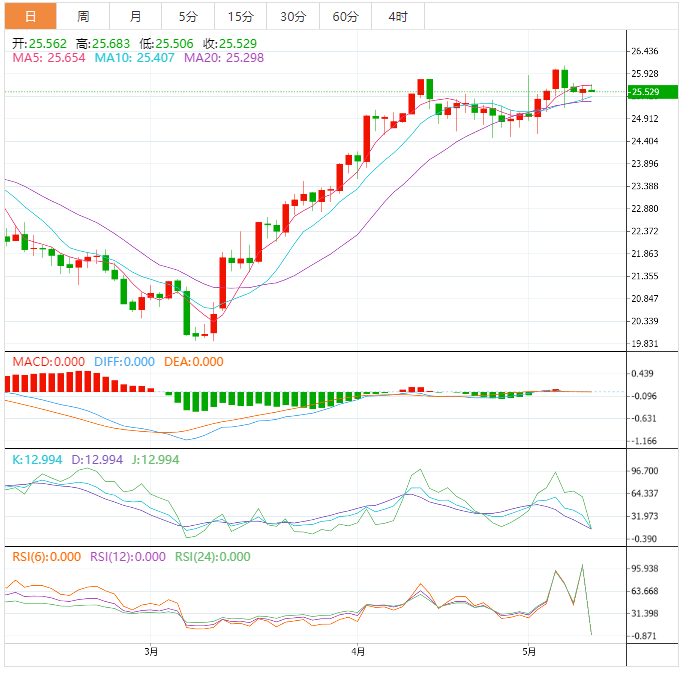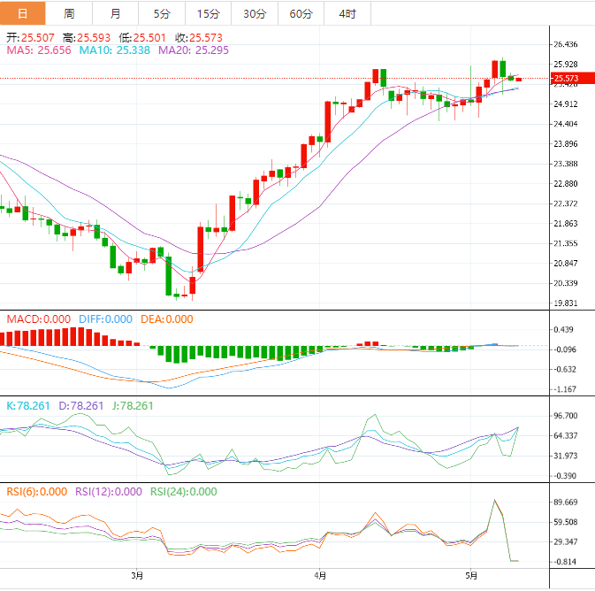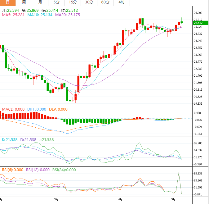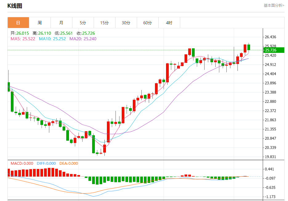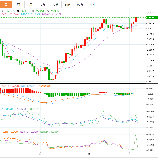 基本消息面 周五(5月5日),现货白银在昨日大涨之后基本持稳,银价现报26.00美元/盎司关口附近。 根据conoi.co,银价稍早成功触及首个看涨目标26.07美元/盎司,假如有效突破这一水平,这将为银价进一步大涨铺平道路。 相关新闻消息 现货白银周四收市飙升1.81%,报26.03美元/盎司。 银价继续上升走势并成功