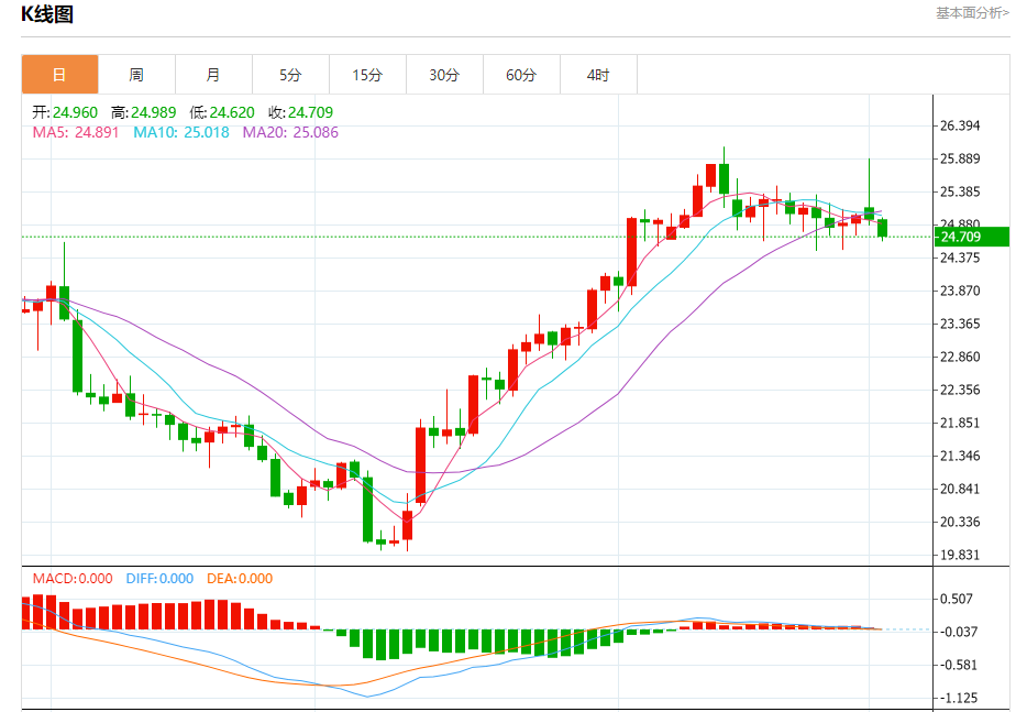 基本消息面 周二(5月2日),现货白银维持日内跌势,银价现报24.90美元/盎司附近。 根据conoi.co,若跌破24.60美元/盎司,这将为银价进一步大跌铺平道路。 相关新闻消息 周一纽约时段早盘,银价一度飙升至25.91美元/盎司,然后银价直线大跌,当日银价收跌0.26%,收报24.98美元/盎司。 银价昨日短暂飙升,并