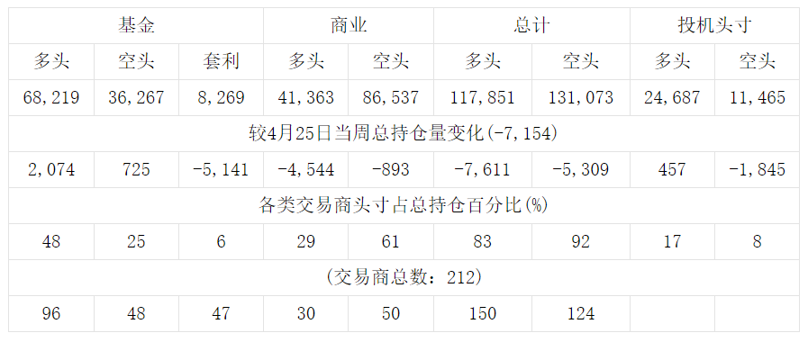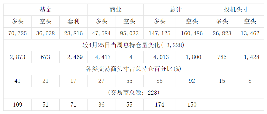美国商品期货交易委员会(CFTC)最新公布截止5月2日当周COX白银期货分类持仓报告: 合约单位:5000金衡盎司总持仓量:142538