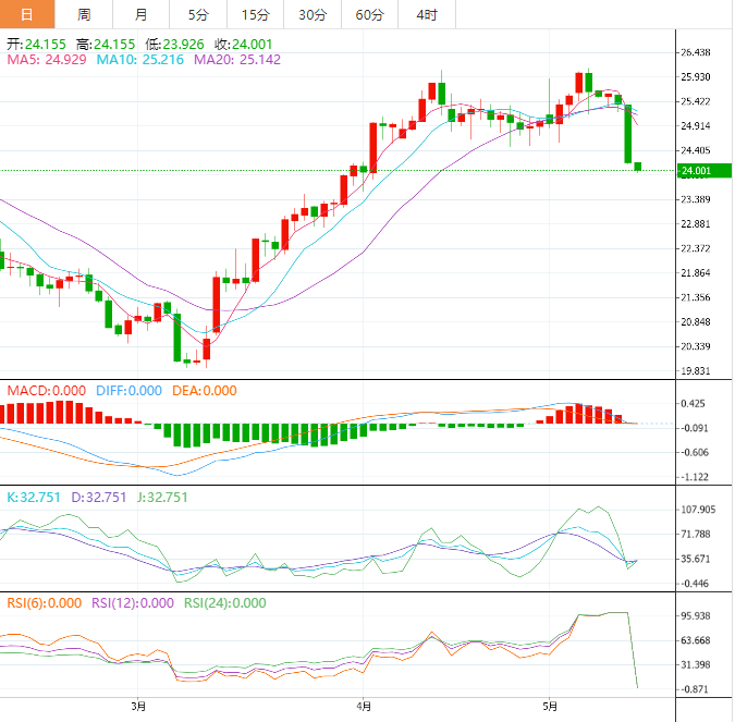 基本消息面 周五(5月12日),现货白银维持日内跌势,银价目前接近24.00美元/盎司关口;周四银价暴跌近5%。 根据conoi.co,银价强势攻克看空目标24.60美元/盎司,后市可能还会进一步下跌。 相关新闻消息 受美元大涨打压,现货白银周四收市暴跌4.75%,报24.175美元/盎司。 银价昨日大幅下挫,强势跌破我们等