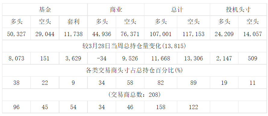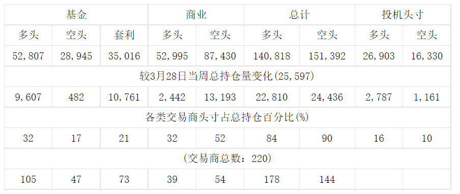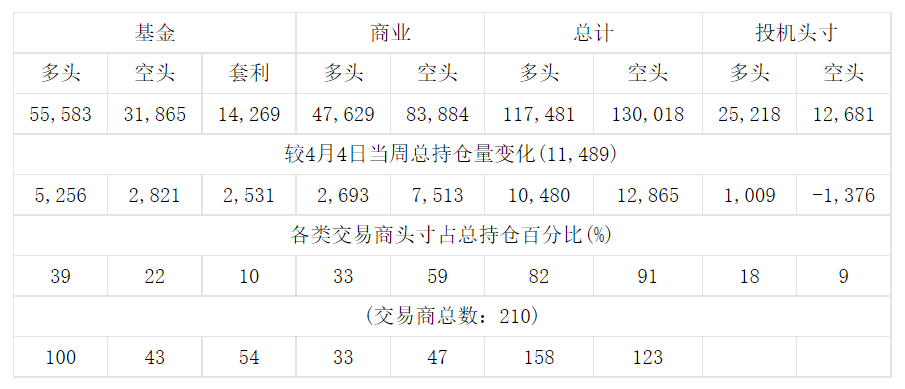 美国商品期货交易委员会(CFTC)最新公布截止4月4日当周COX白银期货分类持仓报告: 合约单位:5000金衡盎司总持仓量:131210