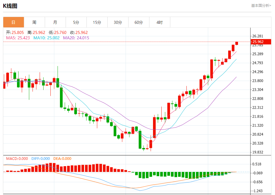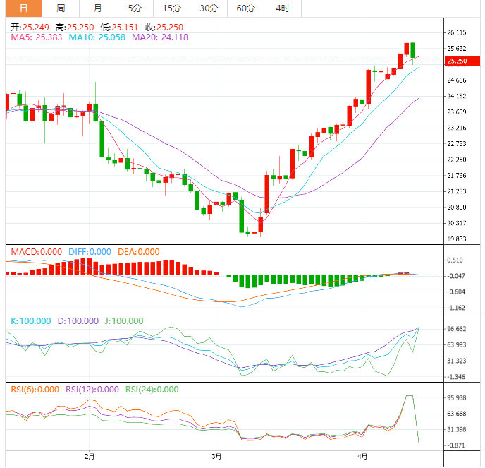 基本消息面 周四(4月13日),现货白银在昨日大涨之后保持坚挺,银价目前位于25.50美元/盎司附近。 根据conoi.co,银价此前已经达成首个目标25.50美元/盎司,若有效攻克这一水平,银价后市有望进一步大幅攀升。 相关新闻消息 受美元大跌推动,现货白银周三收市飙升1.8%,报25.49美元/盎司。 银价此前成功触