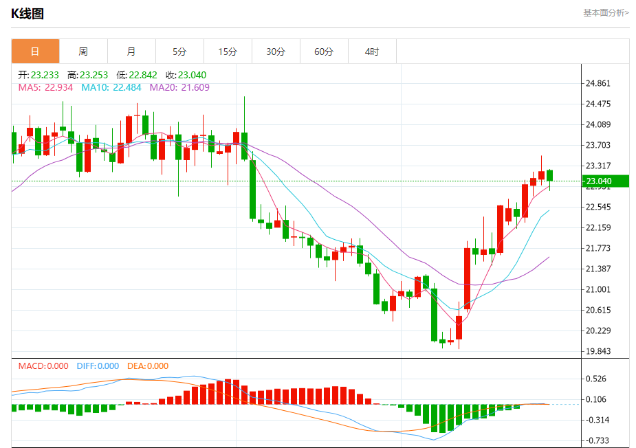 基本消息面 周四(3月28日),现货白银短线突然一波急涨,银价目前升至23.50美元/盎司,刷新日内高点。根据conoi.co,白银技术面继续看涨,银价短期内有望进一步升至24.00美元/盎司。 相关新闻消息 银价显现上升走势并尝试进一步远离23.05美元/盎司水平,这支持银价在日内以及短期内继续预期中的看涨趋势。银价此