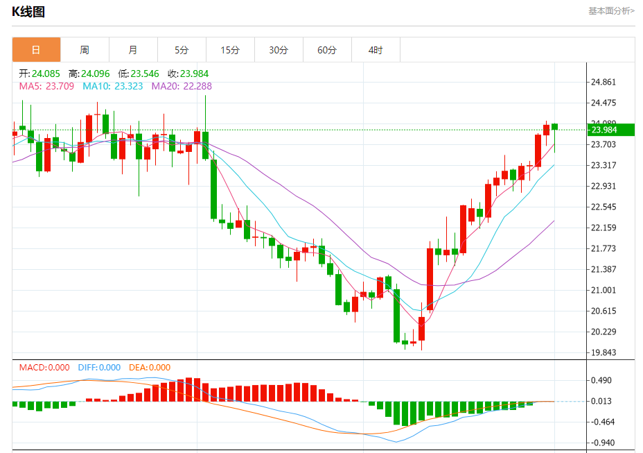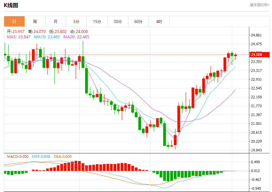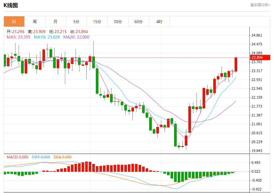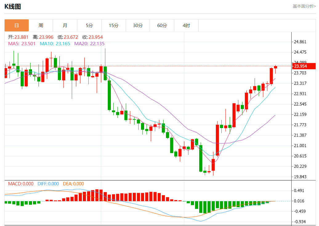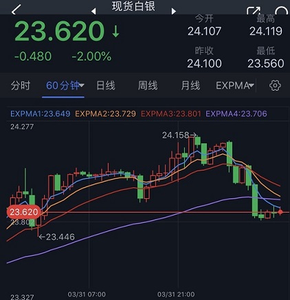 基本消息面 周五(3月31日),现货白银基本持稳,银价目前位于23.90美元/盎司附近。 根据conoi.co,假如攻克首个看涨目标24.00美元/盎司,银价有望进一步飙升。 相关新闻消息 现货白银周四收市大幅攀升2.39%,报23.89美元/盎司。 银价延续升势并接近我们等待的目标价位24.00美元/盎司。如图所示,银价在看
