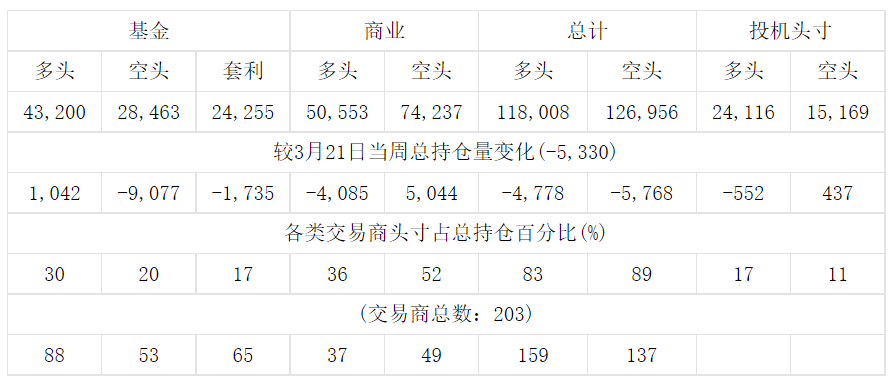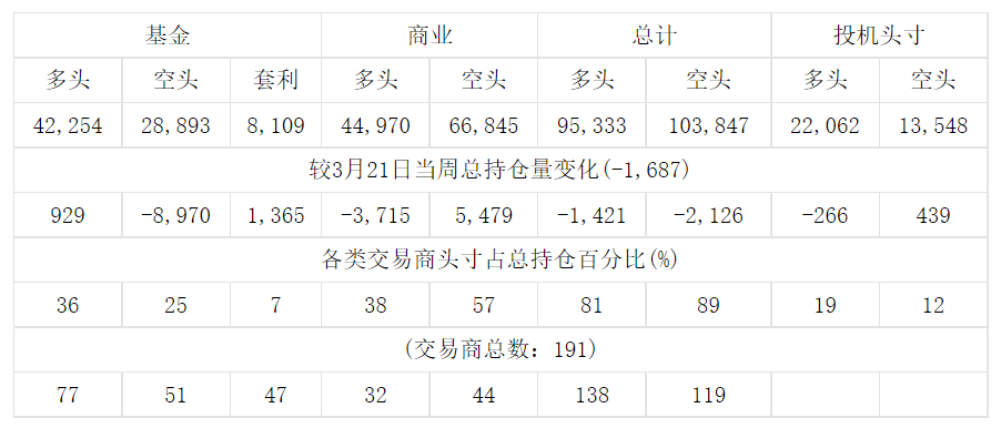 美国商品期货交易委员会(CFTC)最新公布截止3月28日当周COX白银期货和期权分类持仓报告: 合约单位:5000金衡盎司总持仓量:142125