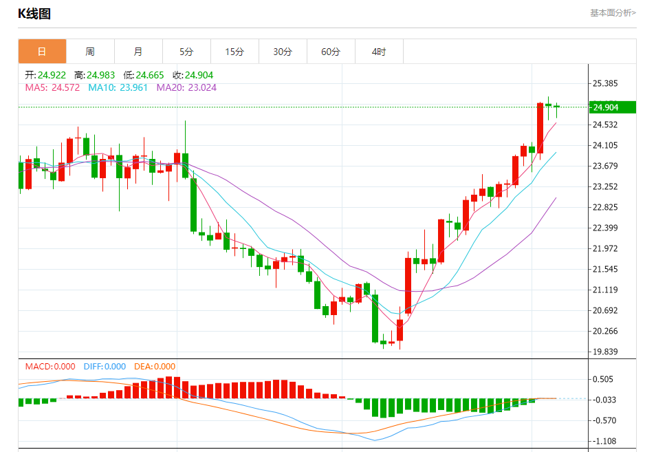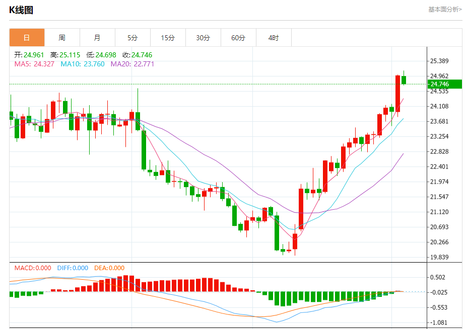 基本消息面 周三(4月5日),现货白银在昨日暴涨之后维持坚挺走势,银价目前略高于25.00美元/盎司。 根据conoi.co,银价已经攻克首个看涨目标24.50美元/盎司,后市存在进一步上升的空间。 相关新闻消息 受美元大跌推动,现货白银周二收市暴涨4.25%,报25.00美元/盎司。 银价昨日大幅上扬、突破我们等待的目