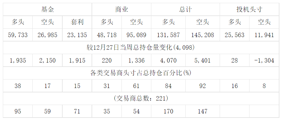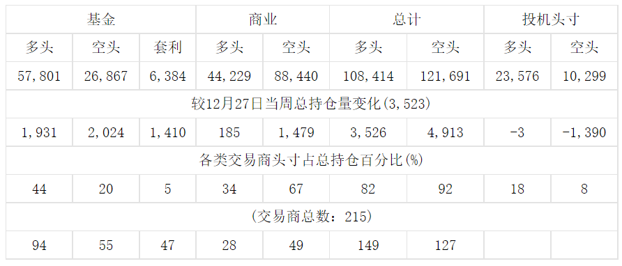 美国商品期货交易委员会(CFTC)最新公布截止1月3日当周COX白银期货分类持仓报告: 合约单位:5000金衡盎司总持仓量:131990