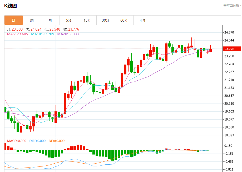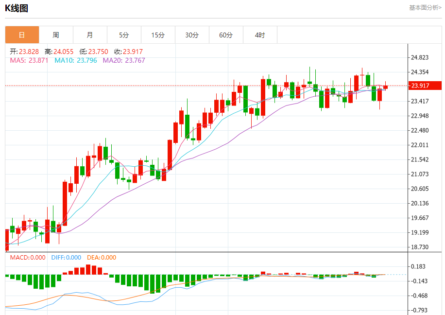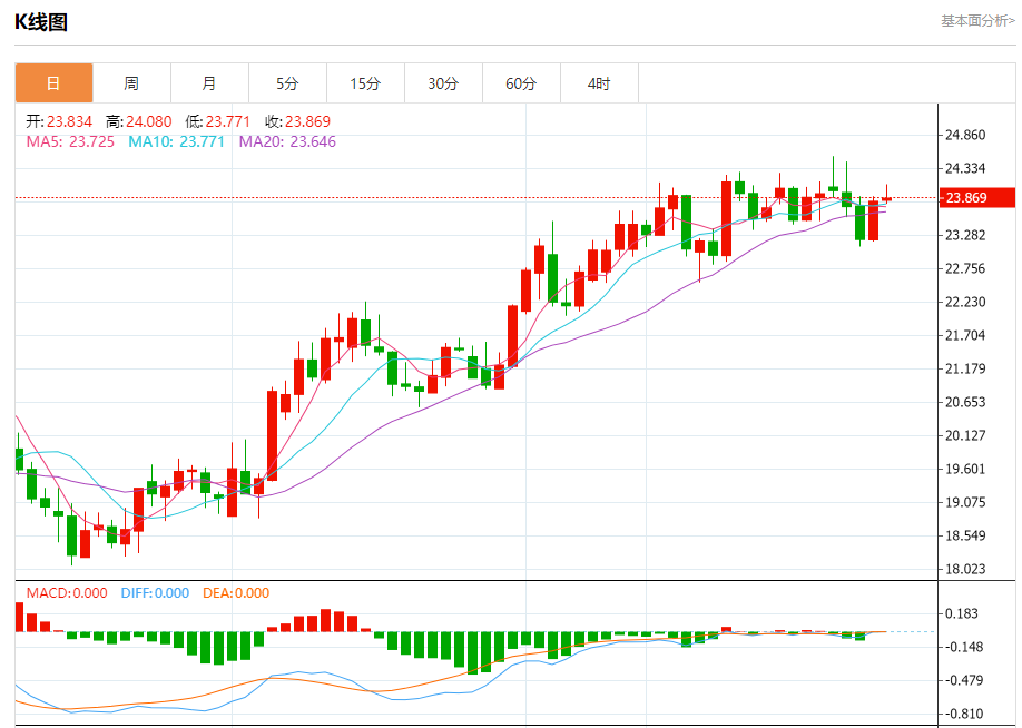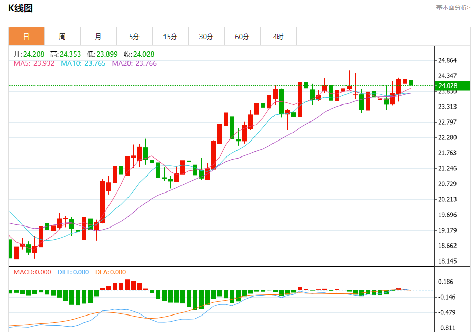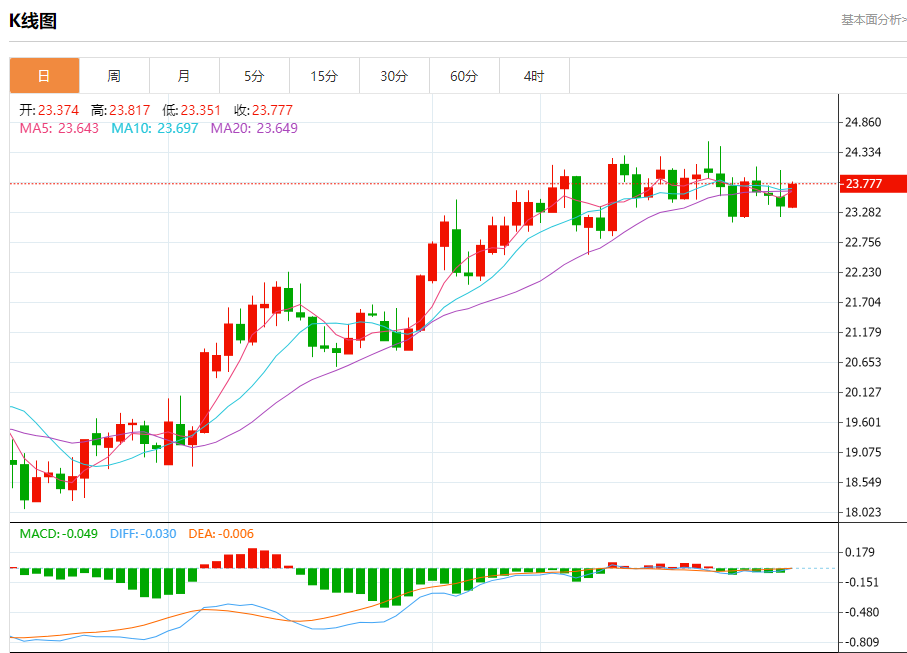 基本消息面 周五(1月20日),现货白银延续升势,银价目前接近23.90美元/盎司。 根据conoi.co,随着银价突破关键水平23.85美元/盎司,后市有望迎来更大涨幅。 相关新闻消息 现货白银周四收盘大涨1.59%,报23.82美元/盎司。 银价突破23.85美元/盎司,止住昨日预测的看跌走势。银价可能首先瞄准24.55美元/盎