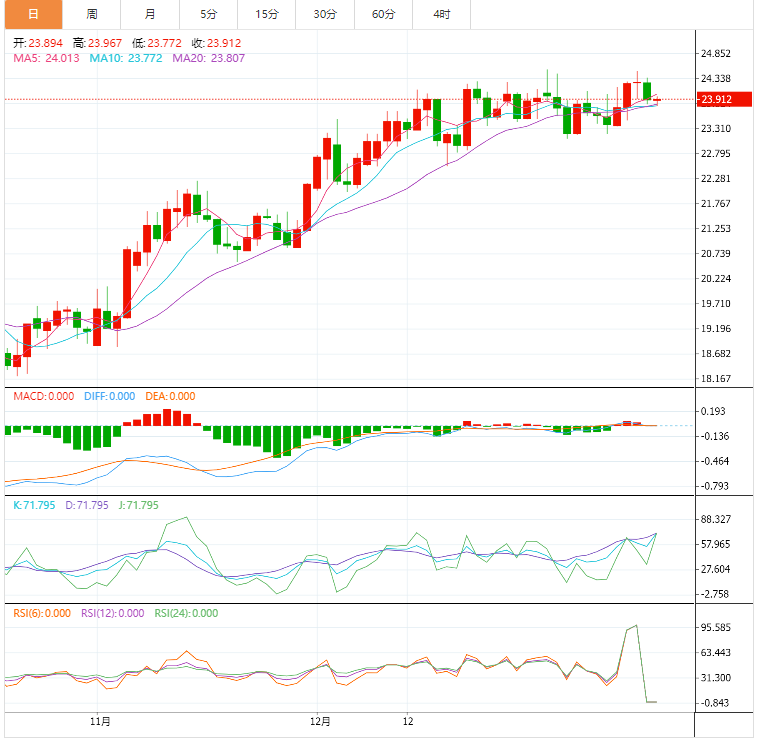 基本消息面 周五(1月13日),现货白银小幅回落,银价目前略高于23.65美元/盎司。 美元指数周四大跌0.9%,至102.29。疲软美元刺激银价走高。现货白银周四收盘大涨1.51%,报23.76美元/盎司。 根据conoi.co,若银价失守23.65美元/盎司,这可能导致银价短期内出现进一步回调。 相关新闻消息 银价周四一度非常