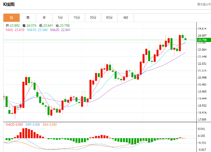 基本消息面 周三(12月28日),现货白银小幅回落,银价现报23.95美元/盎司附近。 根据conoi.co,银价在触及首个看涨目标24.25美元/盎司后回落,但技术面传递看涨信号,若突破24.25美元/盎司,银价后市有望进一步大涨。 受美元走软推动,现货白银周二收盘大涨1.26%,报24.03美元/盎司。 相关新闻消息 银价昨