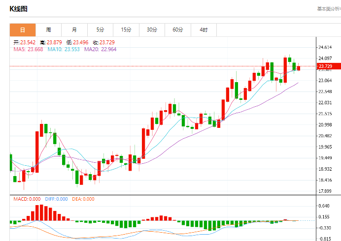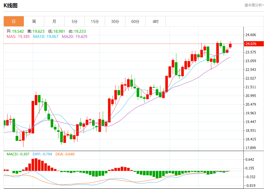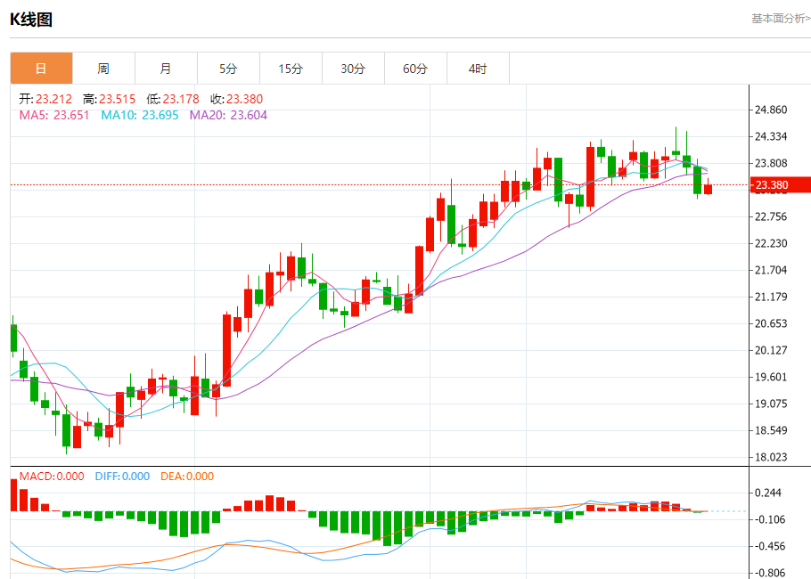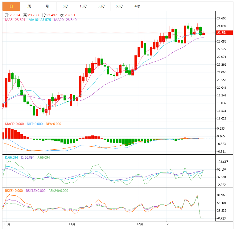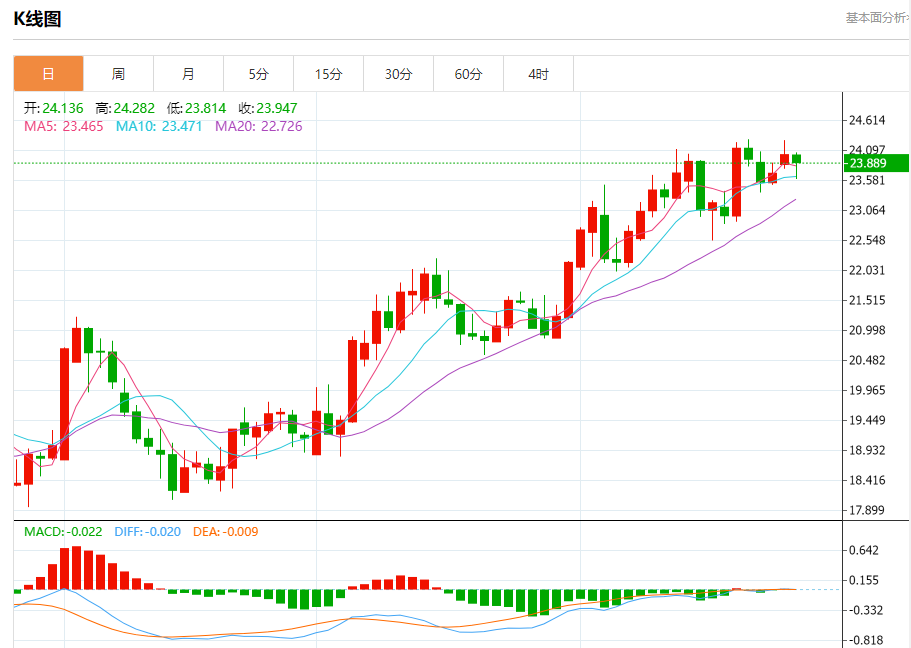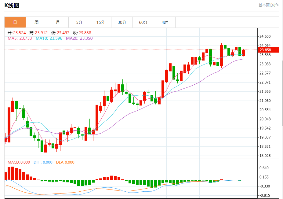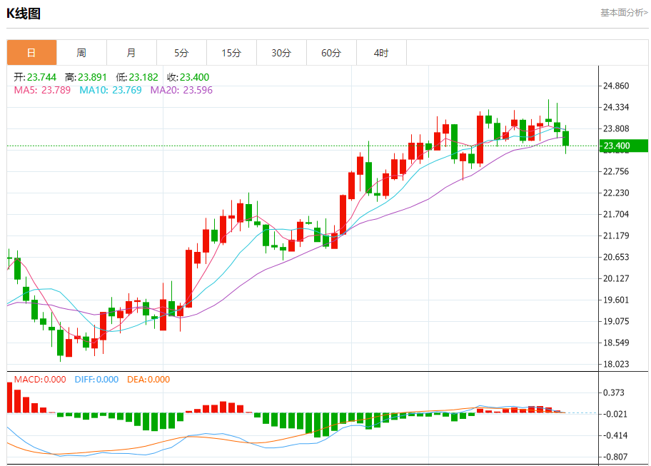 基本消息面 周四(1月5日),现货白银在昨日重挫后基本持稳,银价现报23.75美元/盎司附近。 根据conoi.co,银价已经失守重要支撑位,后市面临进一步大幅回调的风险。 现货白银周三收盘下跌1.08%,报23.74美元/盎司。 相关新闻消息 银价昨日在触及24.45美元/盎司水平后回落,跌破看涨通道支撑线,并开始针对