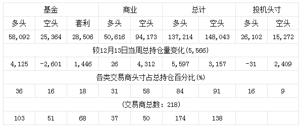 美国商品期货交易委员会(CFTC)最新公布截止12月20日当周COX白银期货和期权分类持仓报告: 合约单位:5000金衡盎司总持仓量:163315