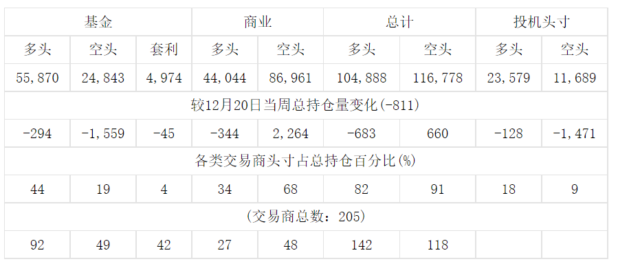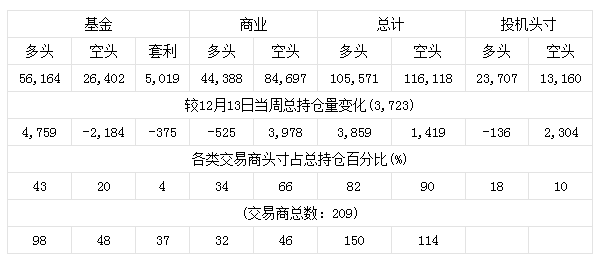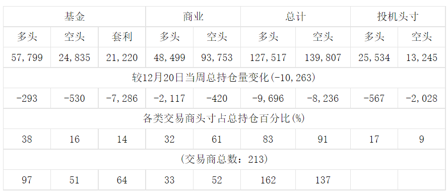 美国商品期货交易委员会(CFTC)最新公布截止12月20日当周COX白银期货分类持仓报告: 合约单位:5000金衡盎司总持仓量:129278