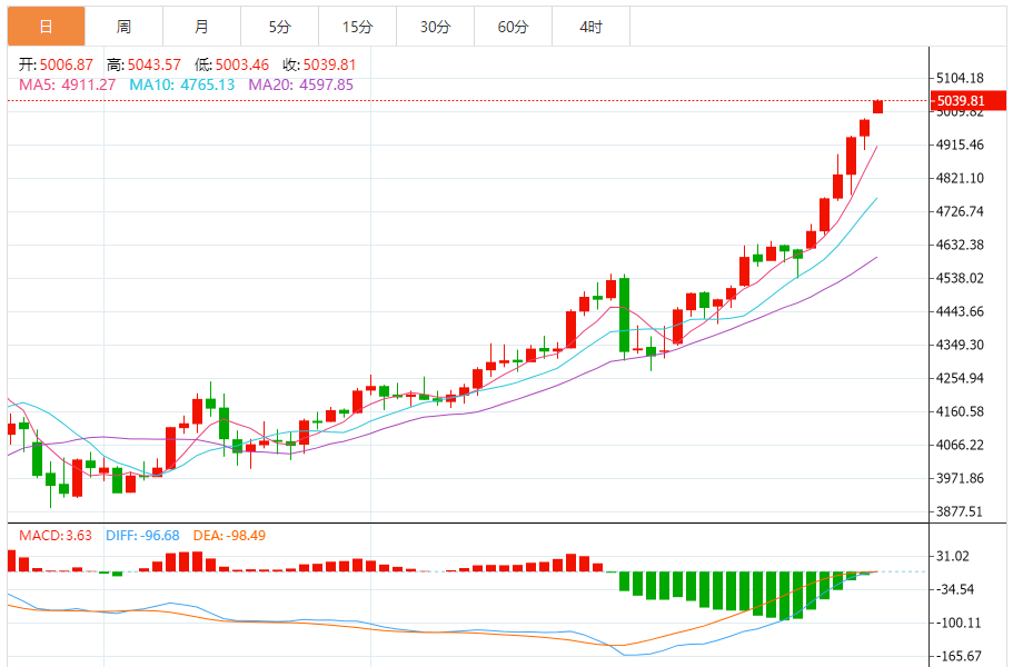 黄金日线图上,布林上轨于1280位置形成关键压制,MA5均线上行与MA30均线于1257形成日内关键支撑,MACD指标继续金叉上行,现目前,上方首要的压力位在上周高点1265一线。