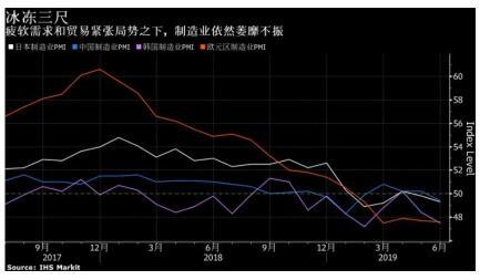 除了贸易纷争再起外,周一公布的全球制造业PMI数据普遍低迷,也对黄金有所支撑。数据显示,欧洲多数地区以及亚洲的制造业6月活动都呈现萎缩,美国制造业增长也降温,这使得全球决策官员在面临中美贸易战之际肩负着逆转衰退压力。