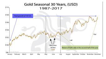 从历史季节性的图表看,金价通常会在下半年大有可为,而夏季往往是最佳的买入时机。