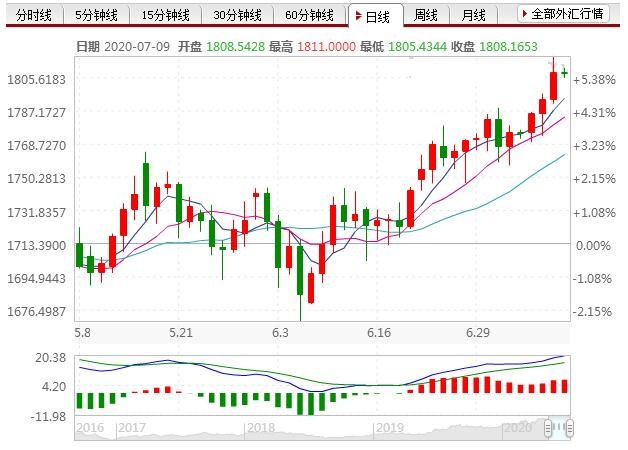 上一交易日金价飙升触及1818.06美元/盎司,为2011年9月19日以来最高水平,低于当时创下的历史高点1920.30美元。