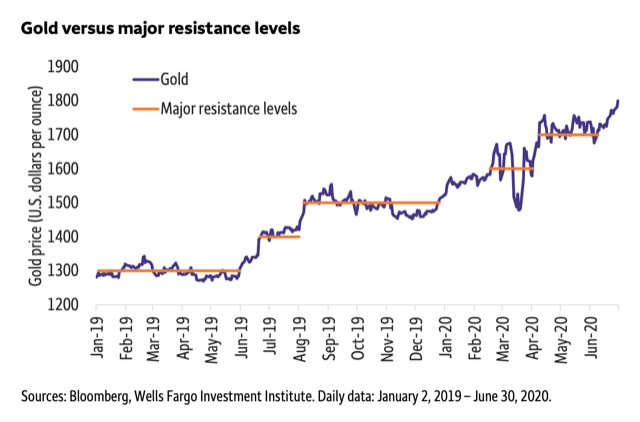 “在2019年5月,经过六年的尝试,黄金最终最终突破了1300美元阻力位。此后的一年里,金价迅速上涨至下一主要阻力位,”富国银行投资策略分析师Austin Pickle写道。“鉴于我们2020年年底的目标是1800-1900美元,我们被问及是否仍喜欢这些价位的黄金。简短的回答是响亮的‘是的’。”