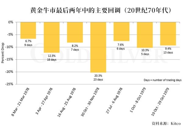 在此轮黄金牛市的最后冲刺阶段里,金价在两年中飙升了392%,同时,也出现了7次大幅回调,平均每三个半月下跌10.1%。其中,所有回调的持续时间小于一个月,有4轮回调的时间小于10个交易日。