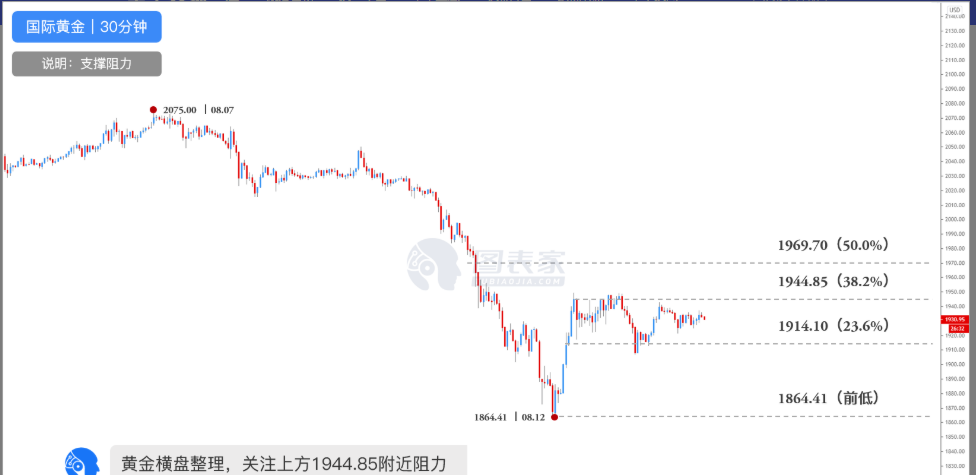 若金价下行,下方较近支撑位为斐波那契23.6%回调位1914.10,跌破后或将进一步看跌至前低1864.41附近。
