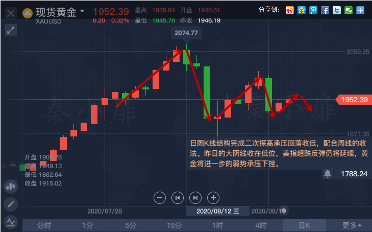 黄金从日线级别看,本周上涨的两根阳线被周三收盘的的一根实体大阴线完全吞没,美指的强势拉升,令黄金价格大幅跳水超过50美金;日图K线结构完成二次探高承压回落收低,配合周线的收法。昨日的大阴线收在低位。美指超跌反弹仍将延续,黄金将进一步的弱势承压下挫。周线和日线将继续加深调整空间,而周初的反弹我们初步可以当作是修正,修正是为了带动指标向下。