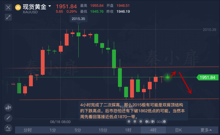 黄金4小时图昨日一波连阴单边下挫,暂时还未出现小阳线反弹修正,使得极弱势的单边延续空间不定,等待4小时伴随阳线反弹后切入做空,切入快速的下跌要伴随反弹修正才能进一步的拉动指标,4小时待反弹空。趋势而言:4小时完成了二次探高,那么2015极有可能是双肩顶结构的下跌高点。后市恐怕还有下破1862低点的可能。当然本周先看回落接近低点1870一带。综合来看,黄金今日短线操作思路上个人建议以反弹高空为主,回调做多为辅,上方短期重点关注1960-1965一线阻力,下方短期重点关注1930-1925一线支撑。