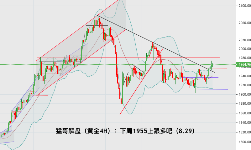 因为周五市场强势打破了2075为高点的下降趋势线的阻力,同时也有效企稳了持续宽幅震荡的1955的阻力,所以下周市场需要依托1955保持低多看涨的布局思路,而上方我们需要关注的则是1975和1981位置的阻力,特别是1981作为前期上涨格局中的关键阻力点,若在后市行情有效企稳的情况下多头将配合日线级别布林带横盘后的开口发散展开新一轮上行走势!