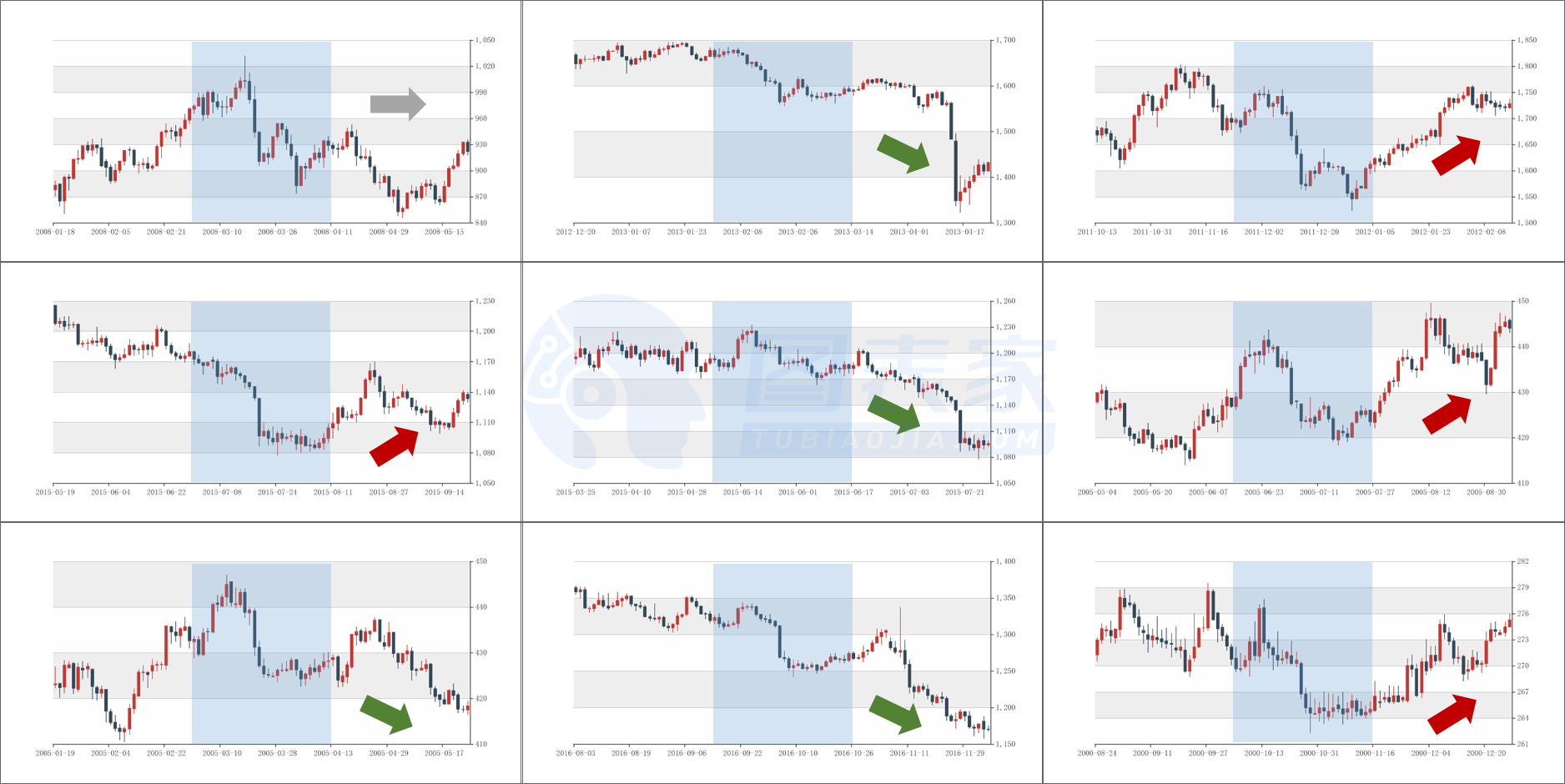 从历史相近走势来看,Data Talks参考过去20个交易日黄金日线走势,在过去19年中寻找相近的价格走势。结果显示,在相关系数最高的9个时间段中,未来20个交易日上涨4次,下跌4次,持平1次,意味着相似K线未能对黄金未来走势提供明显线索。