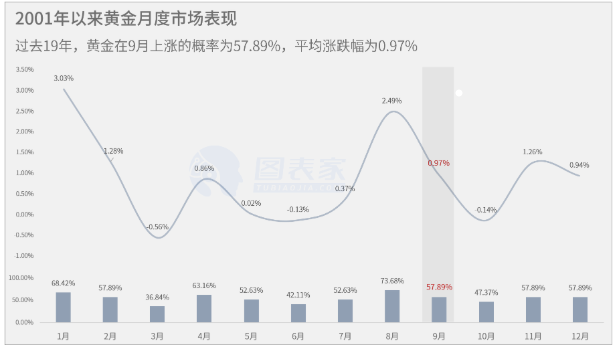 从季节性规律来看,Data Talks研究了黄金从2001年以来的月度数据,结果显示9月黄金上涨概率为57.89%,平均涨跌幅为0.97%。