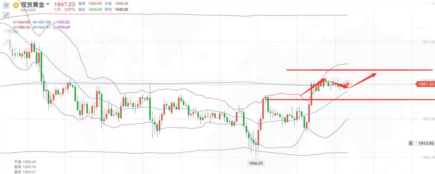 黄金最近行情反复,周二价格破底到位1906一线,随后价格回升,到现在已经算是V型收复周二的跌幅。黄金近期区间震荡,洗盘之后,昨晚最终走出区间,多头强势,形成阶梯式上行格局,欧盘探底1920后走强,美盘黄金自1920开始低位反弹,快速拉升,强势上涨近30美金,突破1940后回踩续涨,边涨边调,步伐稳健,动能强劲,逼近1950关口。黄金此次上涨走出单边行情,是受美元指数大幅回撤支撑。从技术面来看,黄金上方阻力在1960的趋势线*一线。小时线级别,K线此前一直受到均线*,美盘上穿均线,完成多空转换,均线系统1930一线构成强势支撑。综合来看,黄金今日短线操作思路上周品源个人建议以回调做多为主,反弹高空为辅,上方短期重点关注1960-1965一线阻力,下方短期重点关注1940-1935一线支撑。在投资方面有操作上面的问题可以添加笔者交流,态度决定一切,细节决定成败。文章只能给出一个暂时的方向和想法