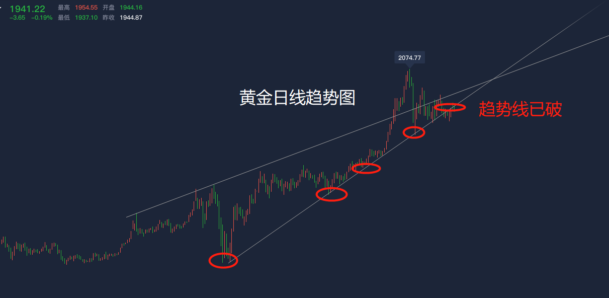 本周总体来说依然是在宽幅的区间震荡内,多空的反复洗盘仍然存在,黄金已经连续四周在1900之上震荡,这个位置也是前期的历史新高,故在没有新的基本面去刺激行情的话,黄金的上涨破新高的动能是不存在的,这一个月以来应该没人再喊去看所谓的2100,2300了吧!目前黄金日线级别上至1440一带的上行趋势线已经被打破,目前处于构建新的趋势当中,所以近期的操作先以短线波段为主,趋势上做单的话也要以逢高做空为主。