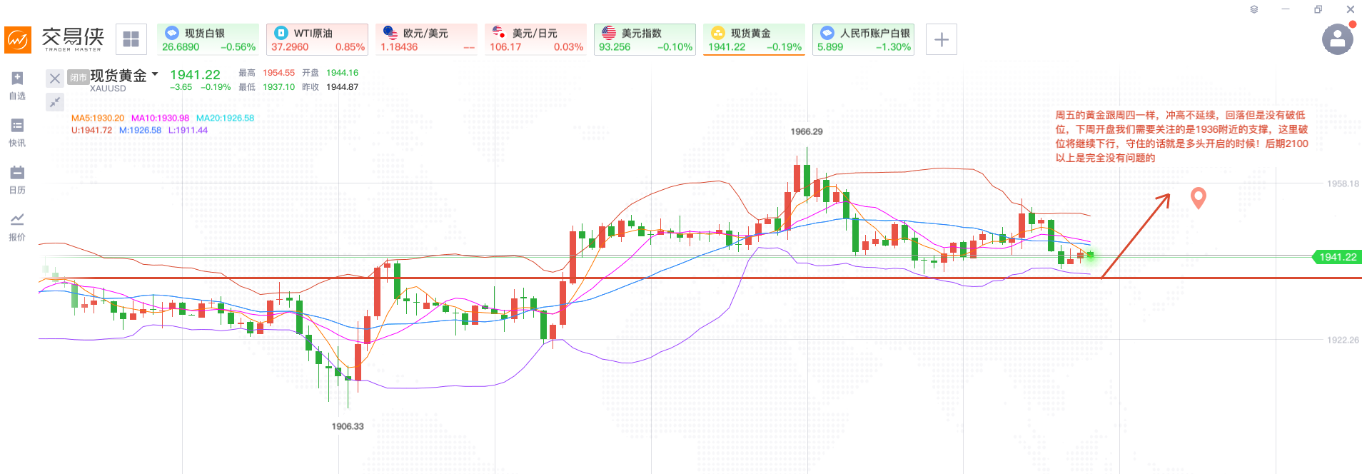 2、黄金下方回踩不破1936-1932一线做多,止损4美金,目标看1943-1945一线;