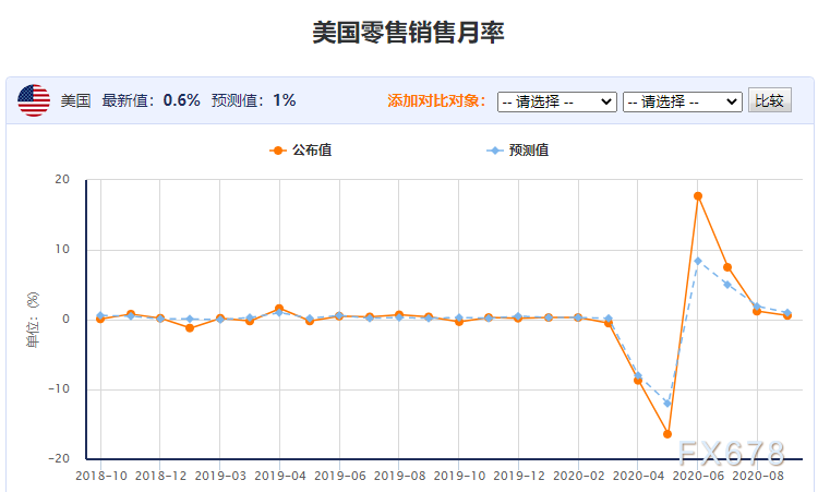具体数据显示,美国8月零售销售月率实际公布0.6%,预期1.0%,前值1.2%;美国8月核心零售销售月率实际公布0.70%,预期1.0%,前值1.9%。