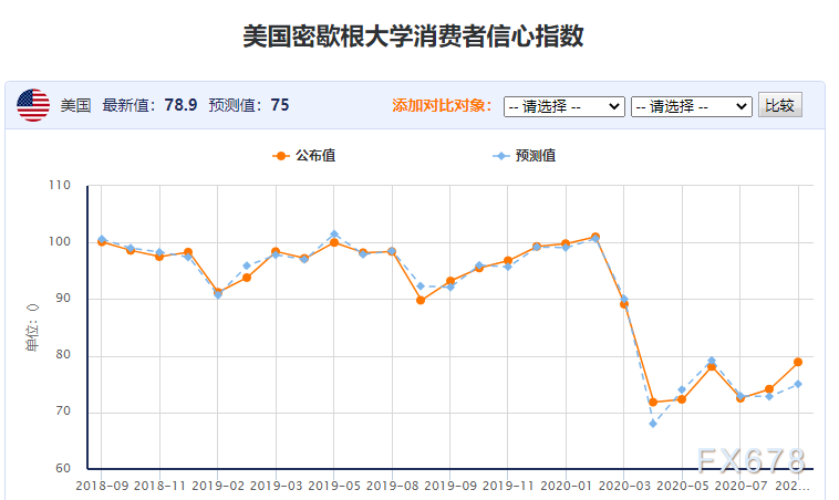 当地时间9月18日,美国密歇根大学发布数据显示,美国9月消费者信心指数初值从上月的74.1上升至78.9,尽管超出市场预期,但仍连续6个月低于80,远不及疫情暴发前的水平。