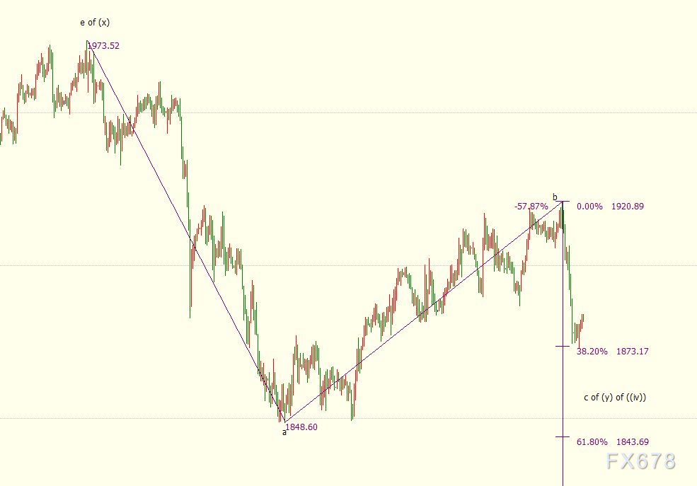日线图上看,c浪是自1974美元开启的下行(y)浪的子浪。(y)浪则隶属于自2075美元开启的调整((iv))浪。金价自2075美元开启的调整((iv))浪继续延伸,后市料跌破(y)浪61.8%目标位1842美元。(y)浪的100%目标位在1761美元。