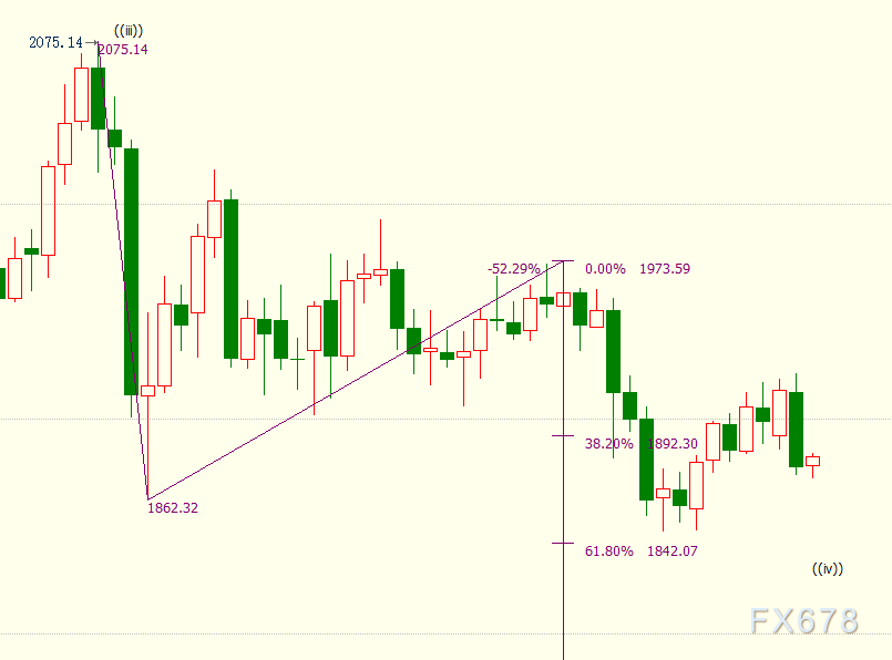 日线图上看,c浪是自1974美元开启的下行(y)浪的子浪。(y)浪则隶属于自2075美元开启的调整((iv))浪。金价自2075美元开启的调整((iv))浪继续延伸,后市料跌破(y)浪61.8%目标位1842美元。(y)浪的100%目标位在1761美元。