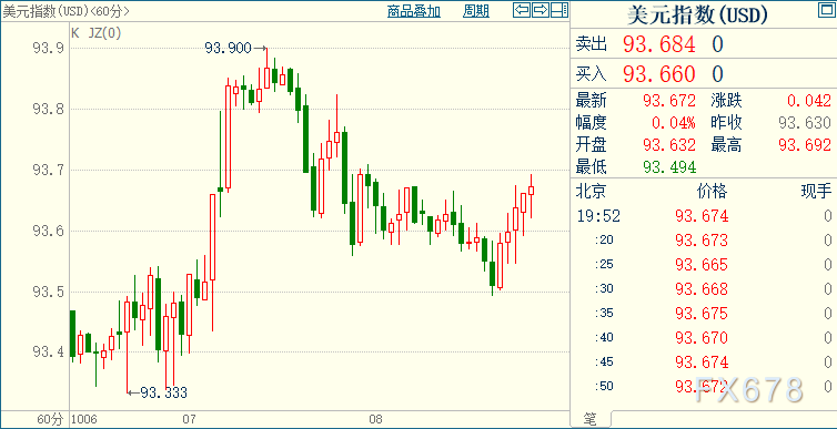 北京时间19:52,现货黄金上涨0.24%至1892.00美元/盎司;COMEX期金主力合约上涨0.28%至1896.1美元/盎司;美元指数上浮0.05%至93.675。