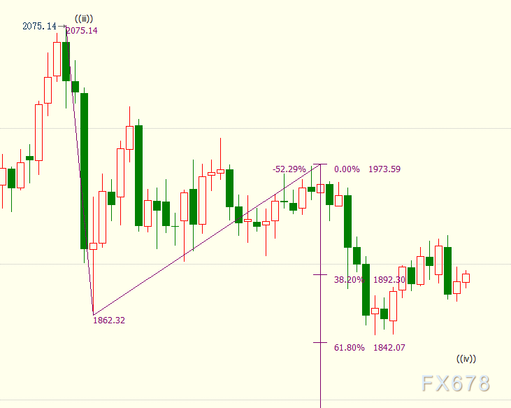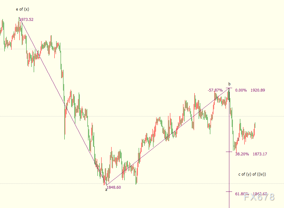 日线图上看,c浪是自1974美元开启的下行(y)浪的子浪。(y)浪则隶属于自2075美元开启的调整((iv))浪。金价自2075美元开启的调整((iv))浪继续延伸,后市料跌破(y)浪61.8%目标位1842美元。(y)浪的100%目标位在1761美元。