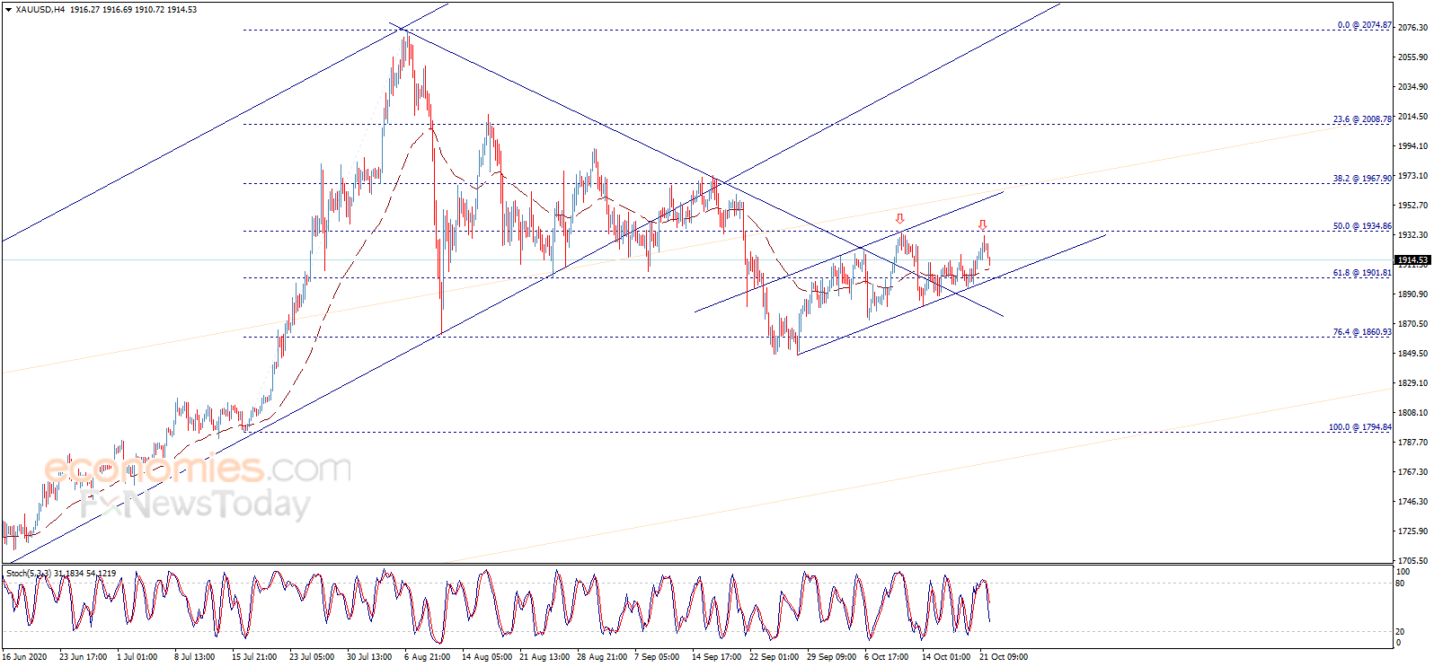 Economies.com预计,今日金价交投将位于支撑位1890.00美元/盎司以及阻力位1930.00美元/盎司之间。