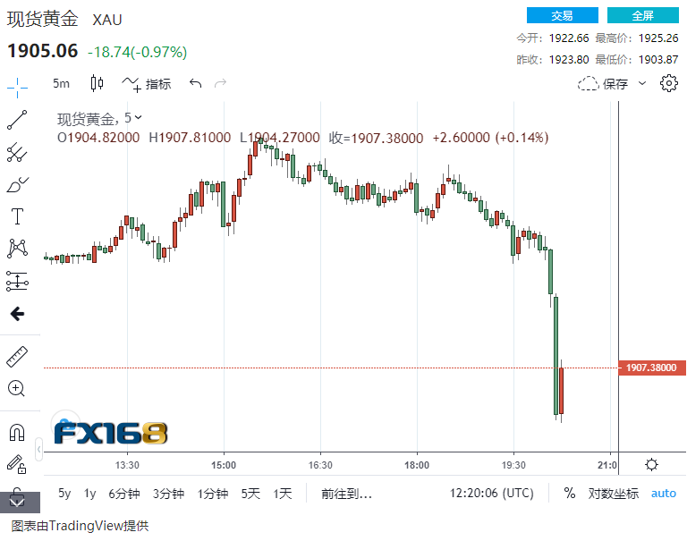 突发行情:金价短线急挫超10美元,最低跌至1903.87美元/盎司,最多跌去超20美元……现货白银短线也下挫,此外COMEX期银日内跌超2%,COMEX期金日内跌超1%。