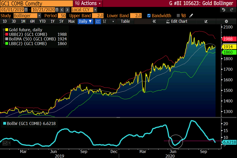 由于现货价格已接近不断收窄的50日布林带通道边界,最近的盘整似乎已经结束。技术面倾向于突破高点。