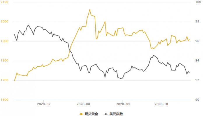 周五(10月23日)黄金T+D创一周新低,现货黄金走高至1910美元/盎司附近,美元指数日内转跌。但国内黄金T+D盘中创一周新低,日内人民币继续走高,且美债收益率升向三个半月高点,不过美国大选前达成刺激协议的可能仍有限,且隔夜美国就业市场意外向好,黄金吸引力下降。