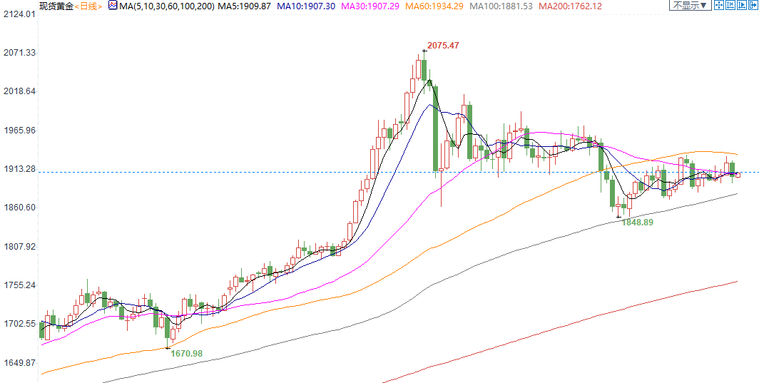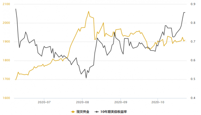 周五(10月23日)现货黄金走高至1910美元/盎司附近,美元指数日内转跌。但国内黄金T+D盘中创一周新低,日内人民币继续走高,且美债收益率升向三个半月高点,不过美国大选前达成刺激协议的可能仍有限,且隔夜美国就业市场意外向好,黄金吸引力下降。