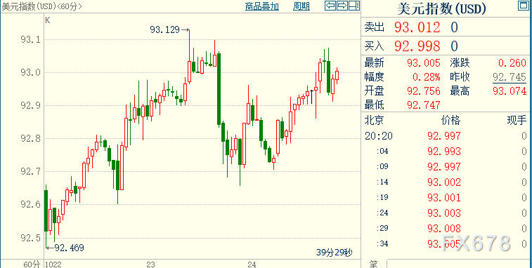 现货黄金下跌0.05%至1901.25美元/盎司;COMEX期金主力合约下沉0.12%至1902.9美元/盎司;美元指数上涨0.29%至93.006。