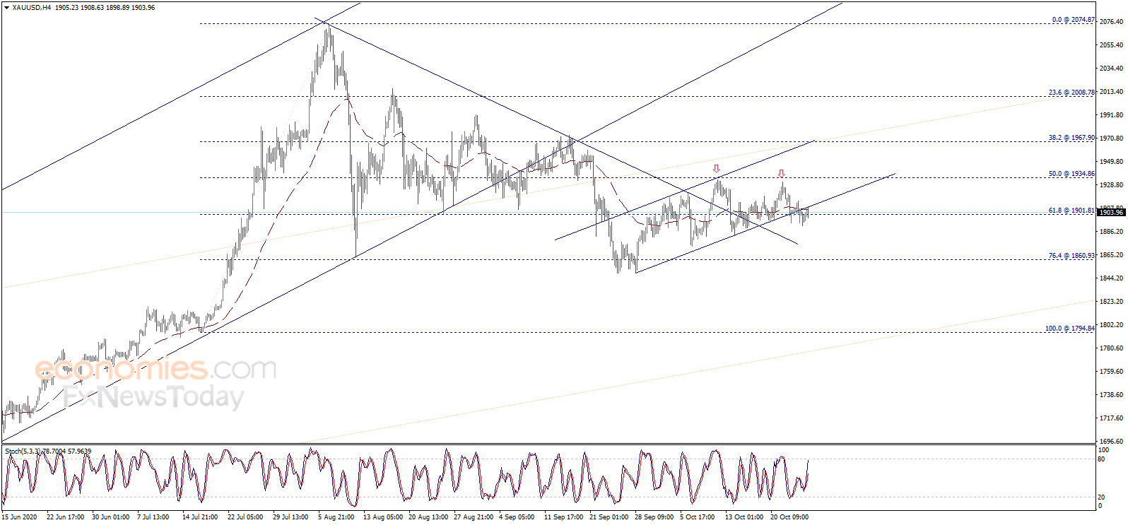 周二(10月27日)亚市早盘,现货黄金小幅上涨,金价现报1904美元/盎司附近。知名财经网站Economies.com最新撰文,对金价后市走势进行分析。