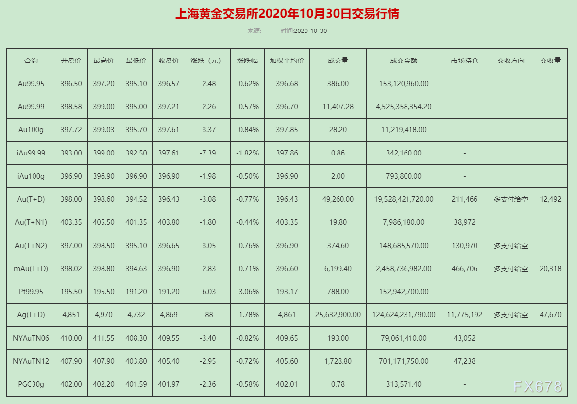 上海黄金交易所2020年10月30日交易行情