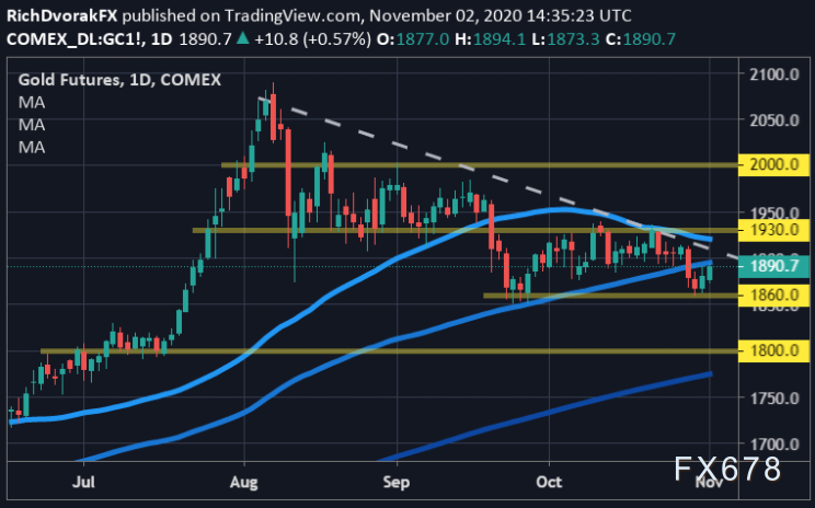 本周伊始,黄金交易势头强劲,试图从上周1.22%的跌幅中反弹。金价目前在每盎司1895美元左右徘徊,此前从9月28日以来低点1860.07美元的技术支撑上反弹。该区域可能继续为金价未来走势提供一个支撑区间。