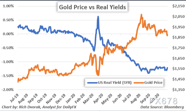 (黄金与5年期国债收益率走势图)